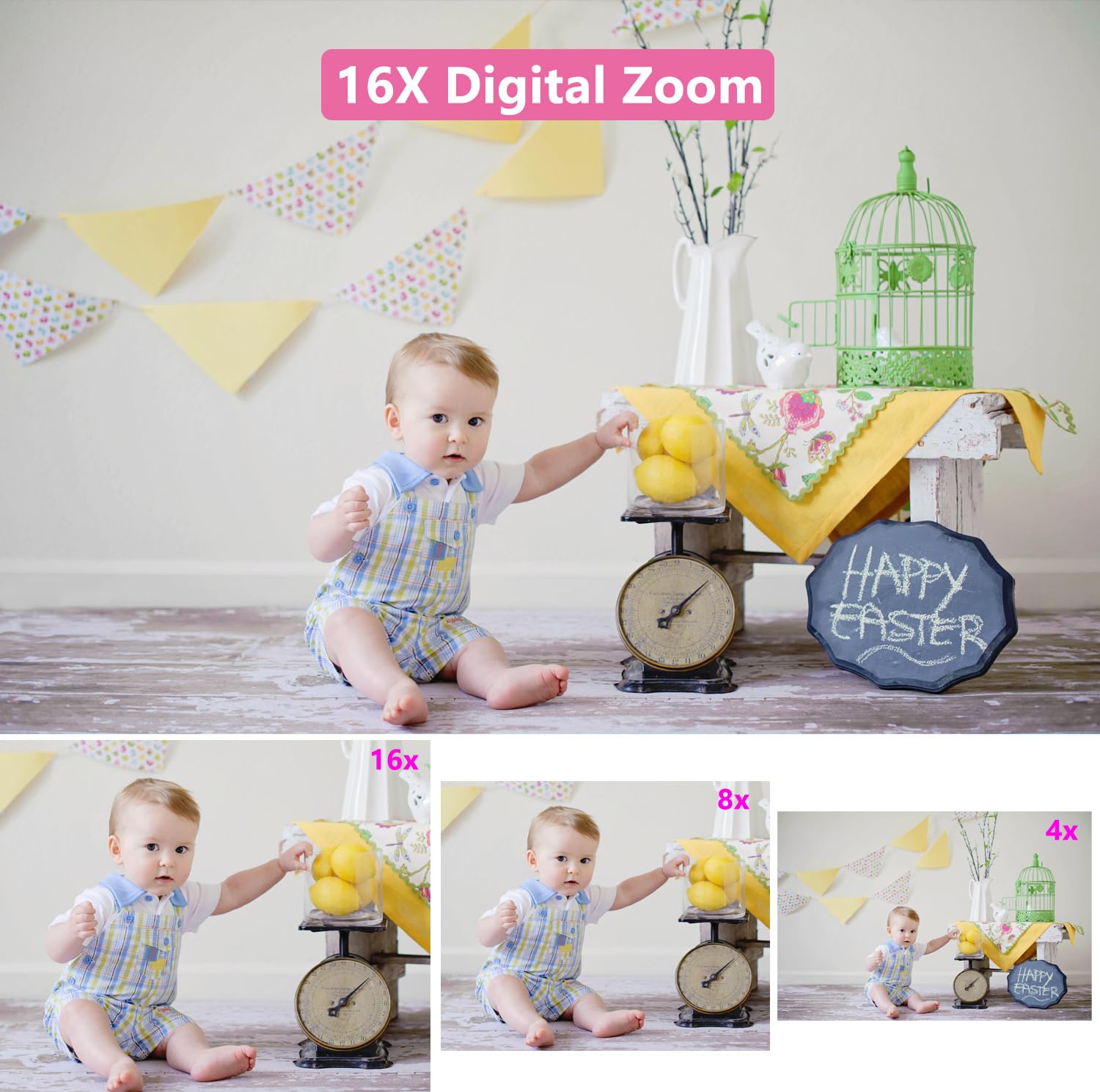 【16X DIGITAL ZOOM & MULTIFUCTIONAL HD DIGITAL CAMERA 】: This kids digital camera supports 16x digital zoom, You can zoom in or zoom out the subject by pressing the W/T button while recording video and taking still images. This Mini camera was also equipped with anti-shake, face recognition, Smile detection, continuous shooting, self-timer, beauty function and flexible capturing the shooting subject.