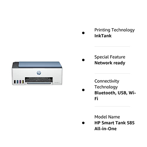 Additional Printer Function:For Home and Small Offices, Included Components: HP Smart Tank 585 All-in-One Printer; GT53XL Black Original ink Bottle; HP GT52 Cyan Original Ink bottles; HP GT52 Magenta Original Ink bottles; HP GT52 Yellow Original Ink bottles; HP Black Printhead; HP Tri-color Printhead; Power cord; Ink caution flyer; Setup guide; Reference guide; Regulatory flyers; Warranty flyers