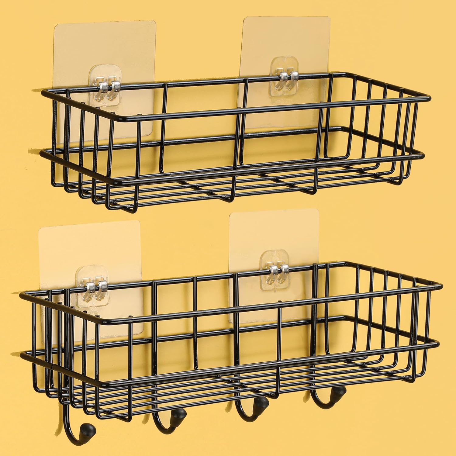 iSTAR GI Steel Self-Adhesive Multipurpose Bathroom Shelf with Hooks/Towel Holder/Bathroom Rack/Bathroom Accessories-Wall Mount – (Black,Powder Coated) (Pack of 2)