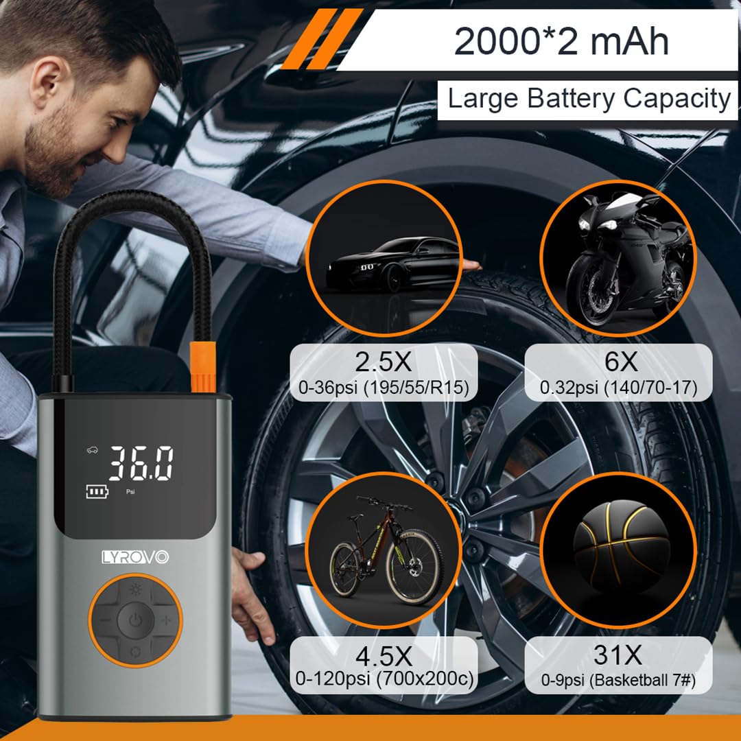 【Portable Design】The portable air pump adopts a compact cordless design, which is compact and convenient to carry. It is equipped with a storage bag that is easy to store in the car, bike rack, or backpack, making it perfect for use on the travel or at home. With multiple attachments included, the Lyrovo cordless tire inflator is a must-have for drivers, cyclists, and adventurers.