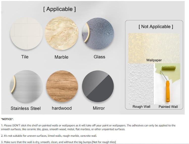 BATHROOM SHELF Suitable for Wall Types: With adhesive sticker, the corner shower rack fit for any NON-POROUS & SMOOTH &FLAT surface, ceramic tile, granite, stainless steel, acrylic, laminate and any non-porous surface with glossy finish. No drilling required, never damaging your wall.
