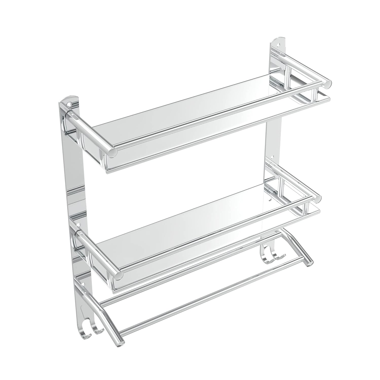 Stainless Steel Double Layer Shelf with Towel Rod – Bathroom Shelves for Optimal Storage, with Sleek Chrome Finish – Durable Bathroom Accessories and Fittings (5D X 15W X 18H Inch)
