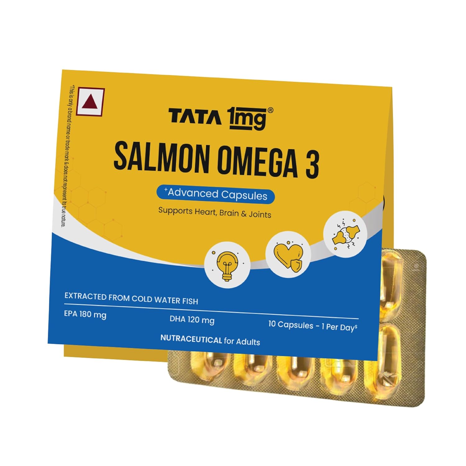 TATA 1mg Salmon Omega 3 Fish Oil Capsules 1000mg with Vitamin E | Advanced Fish Oil with 180mg EPA & 120mg DHA | High absorption for Heart, Brain & Joints | Helps manage cholesterol | Pack of 10