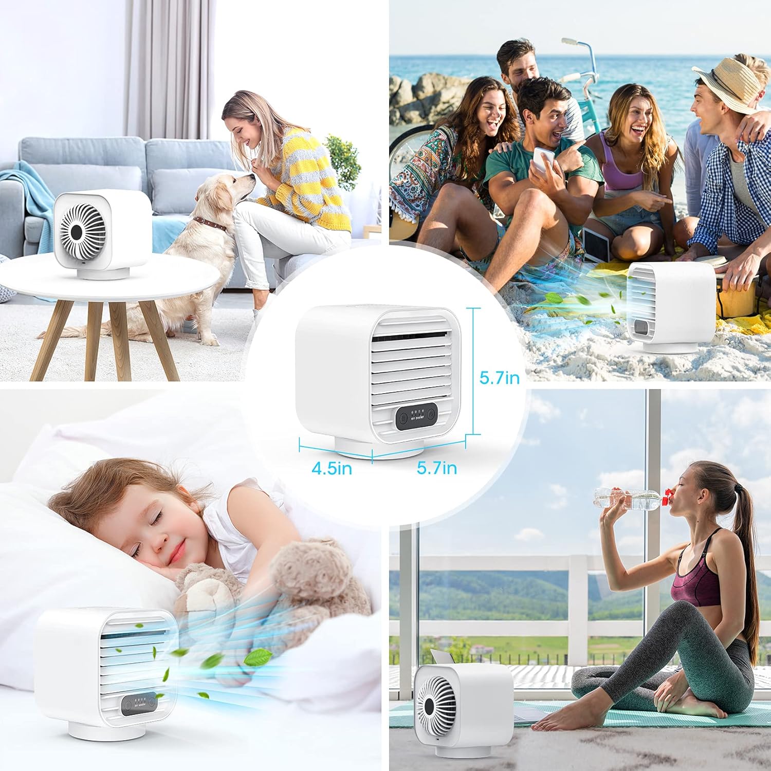 【Portable Rechargeable Design】The small portable but powerful air conditioner fan is with really portable Size 5.7*5.7*4.5 inches, you can it to everywhere you want, Office or Outdoor Camping. The Mini Air Conditioner is built 2000mAh Battery, it can work for up 5 hrs after fully charged. No Power Cable needed, you can finally actualize true wireless Enjoy.