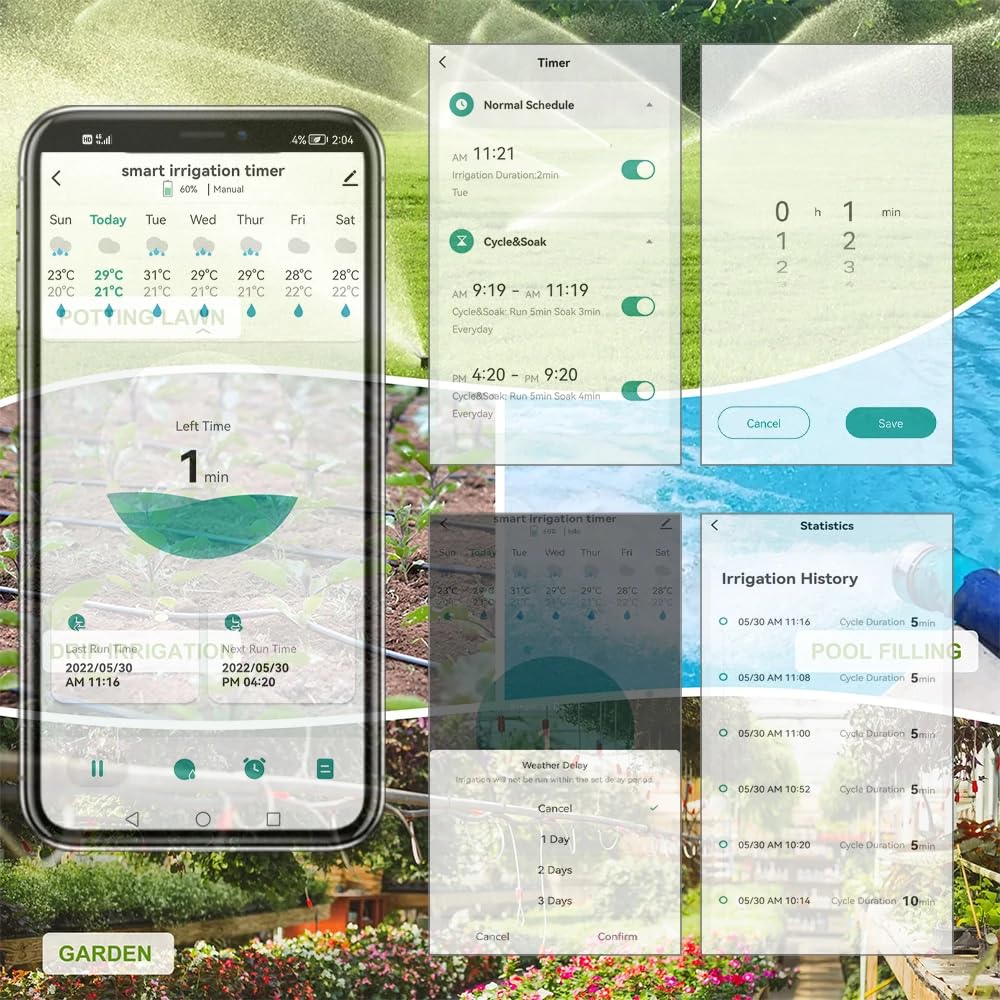 Multi function: The running time can be set as low as 1 minute, which is suitable for drip irrigation and spraying. Timing and cycle timing along with preferred start and ending time can be easily set on the App